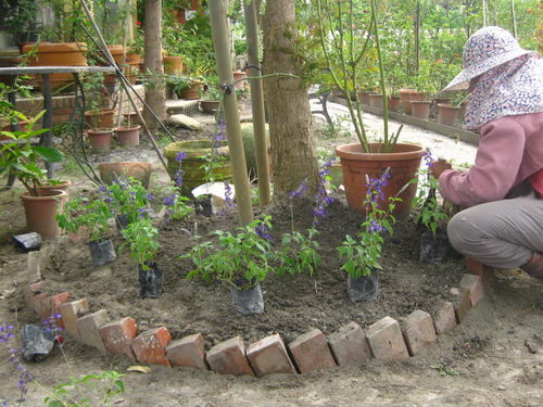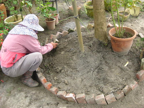 拿著紅磚繞著大葉欖仁樹圍一圈