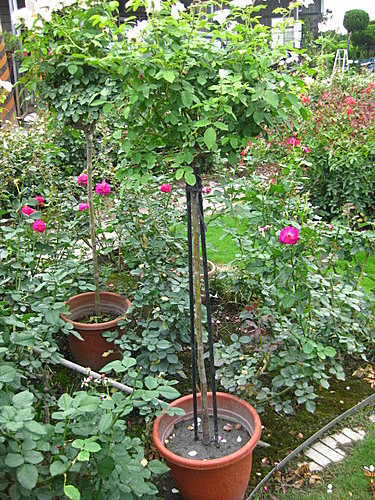 使用笨重的鐵棒支撐樹玫瑰,不實用又容易生銹腐壞!